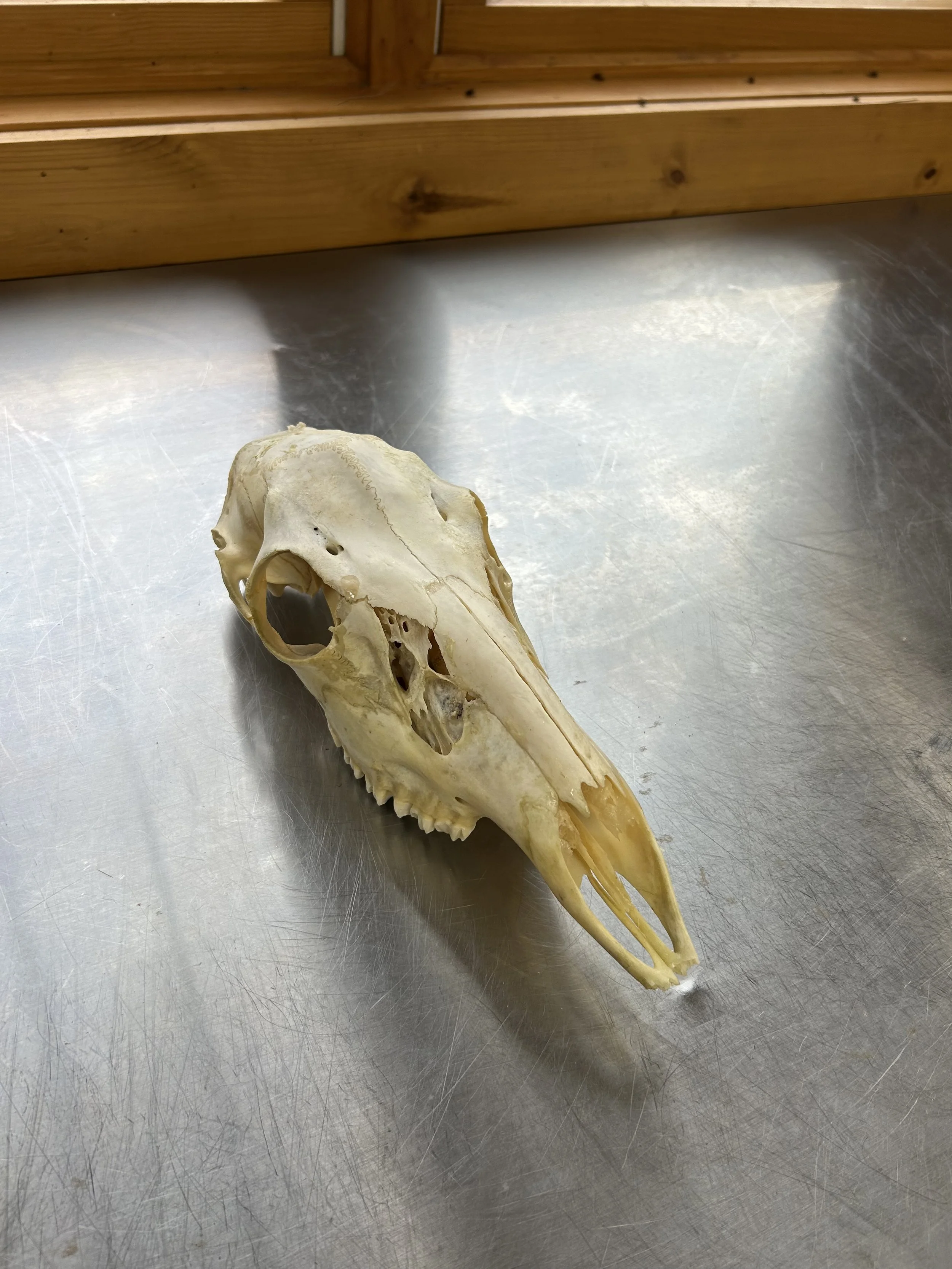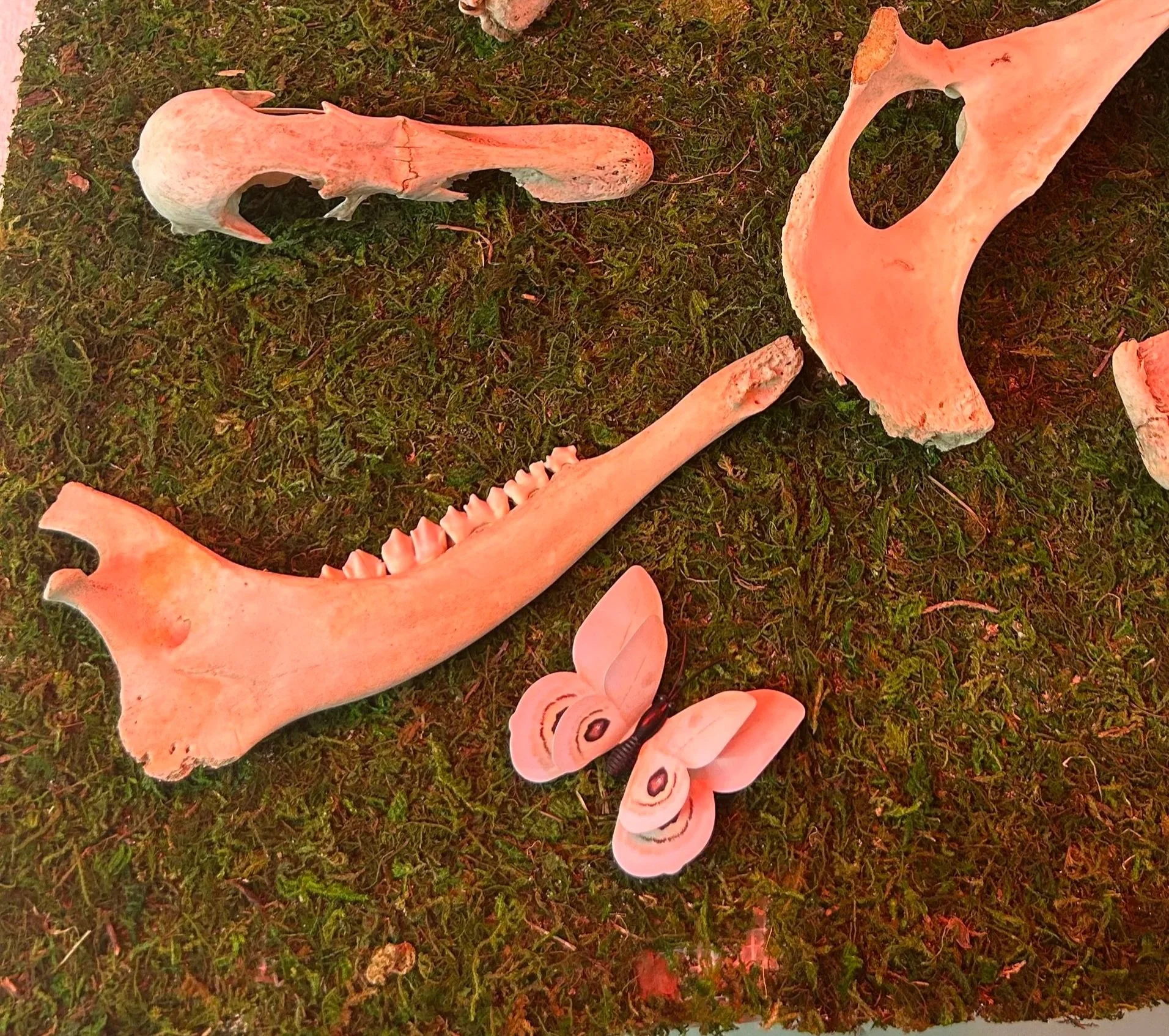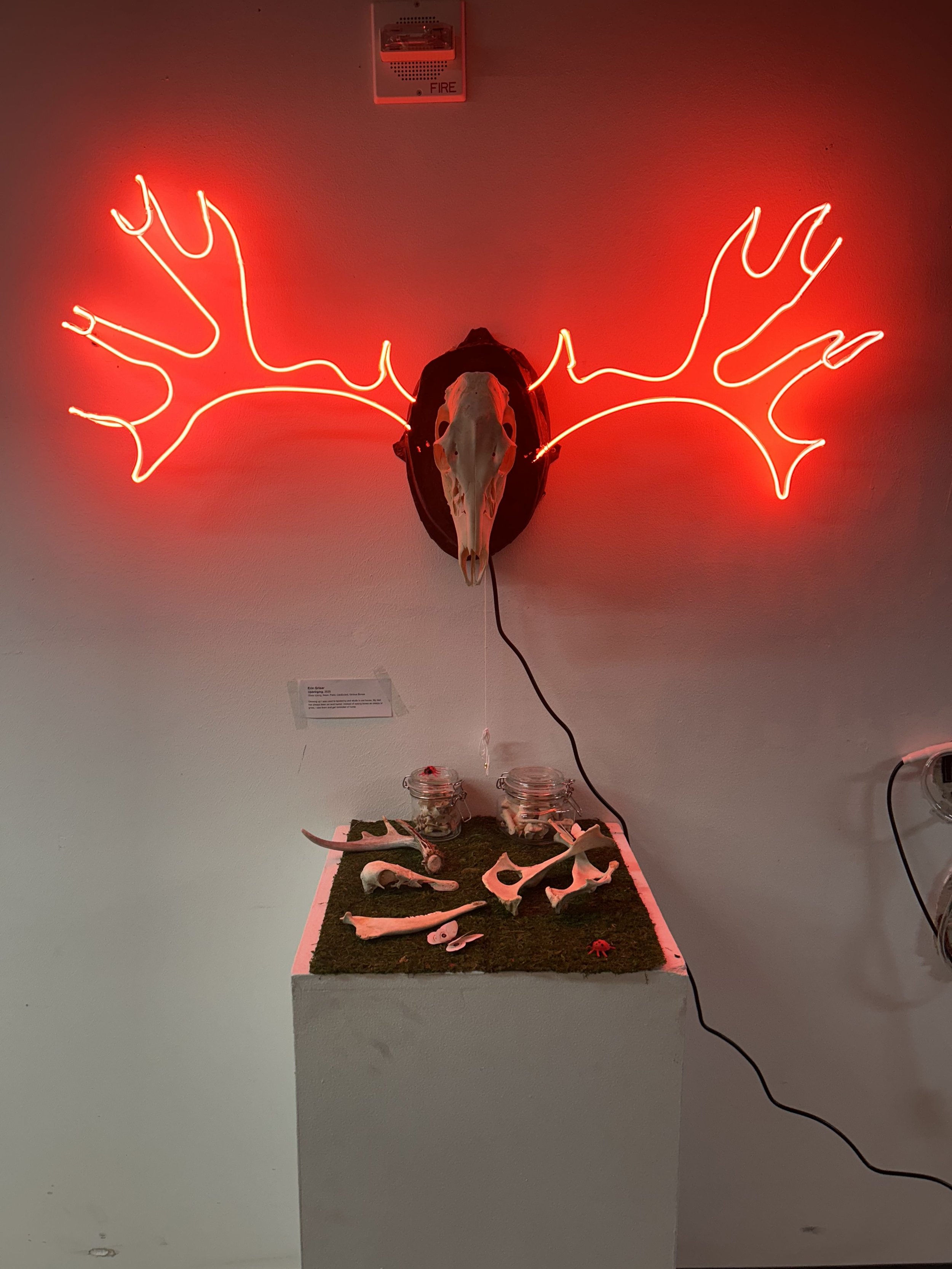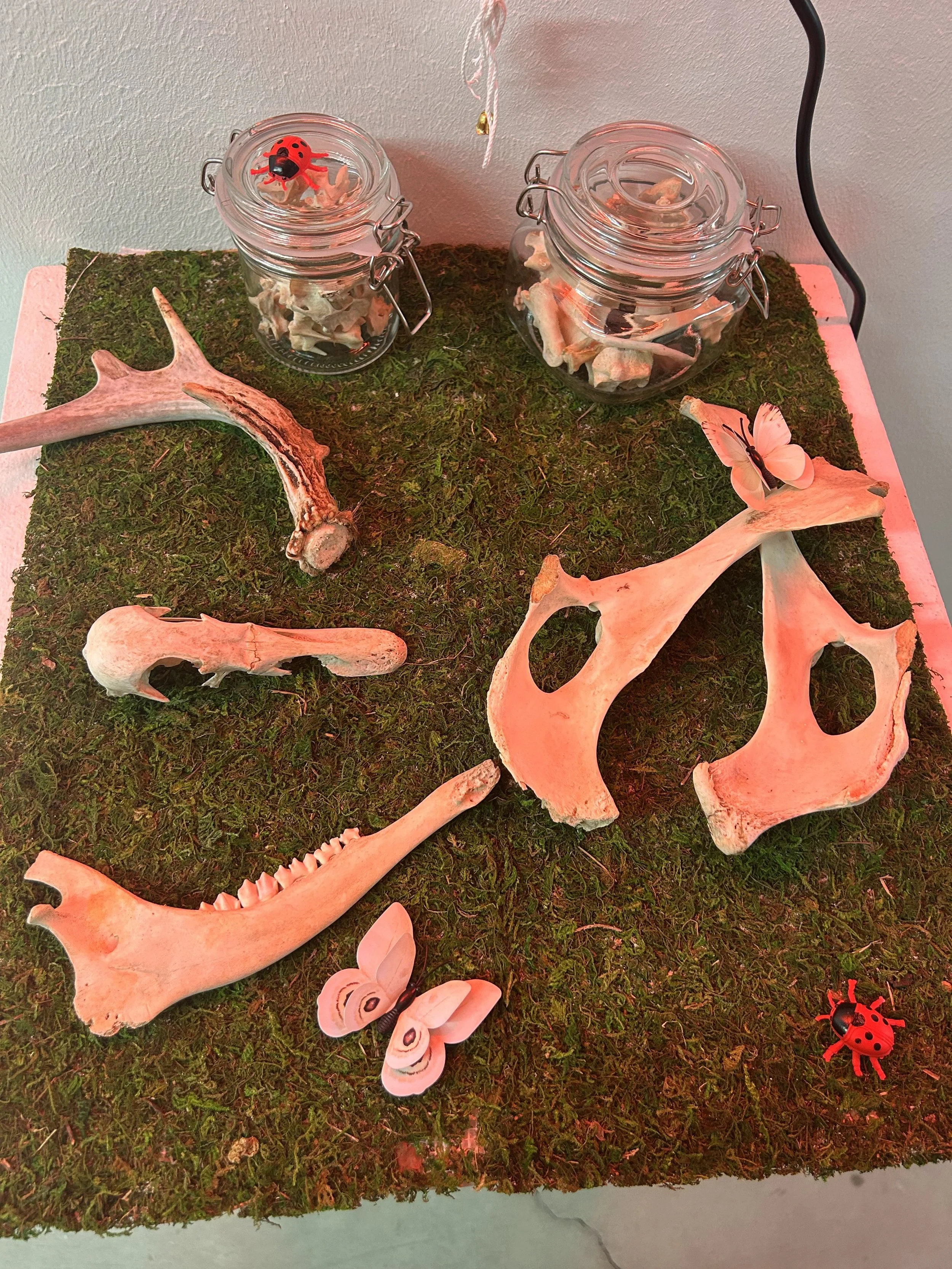 Growing up in a rural area with a hunter as a father, I had always been more comfortable around bones and taxidermy than the average kid. As I understood more about life, I saw beauty in death and decay. This piece explores the relationship between light and death, manufactured materials and organic material, and my relationship with home. All bones were found in my yard and boiled and cleaned by my roommates Natalie, Emma, and me.